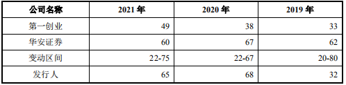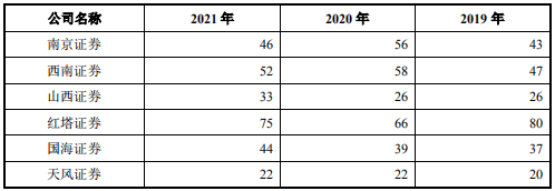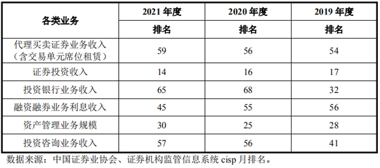 根据中国证券业协会的统计数据,2019年、2020年和2021年,公司投资银行业务收入排名分别为32名、68名和65名,同行业可比公司的排名如下: