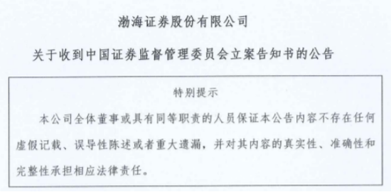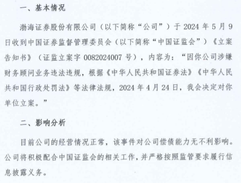 5月13日,渤海证券披露《渤海证券股份有限公司关于收到中国证券监督管理委员会立案告知书的公告》,渤海证券于2024年5月9日收到中国证监会《立案告知书》(证监立案字0082024007号),内容为:“因你公司涉嫌财务顾问业务违法违规,根据《中华人民共和国证券法》《中华人民共和国行政处罚法》等法律法规,2024年4月24日,我会决定对你单位立案。”