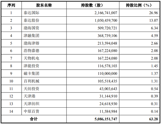 发行人的实际控制人为天津市国资委,天津市国资委通过泰达国际、泰达股份、渤海国资等14家股东最终控制的发行人的股权比例为63.28%,具体情况如下表: