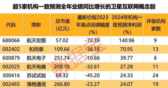 苏试试验、和而泰、航天电器均获得超10家机构评级。结合5家以上机构给予的2024年业绩预告数据来看,6股全年业绩有望实现同比增长,其中航天宏图、和而泰的业绩预计增幅居前,机构一致预测净利润增幅分别为140.96%和70.95%。
