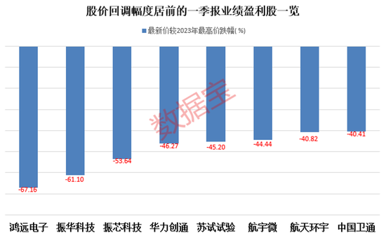 个股来看,五成概念股的最新股价较2023年高点回调幅度超40%,其中航天宏图、鸿远电子、振华科技的股价回调幅度居前,均超60%。剔除一季度业绩亏损的个股后,鸿远电子、振华科技、振芯科技、华力创通、中国卫通等8股回调幅度超40%。