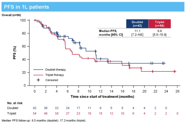 研究结果显示,共有96名患者分别接受了双药治疗(n=42)和三药治疗(n=54),两组患者中位年龄均为66岁,≥97%的患者为Ⅳ期。截至2023年10月31日,双药组和三药组的ORR分别为52%和56%(图3),双药组的中位PFS更优达11.1个月(图4)。