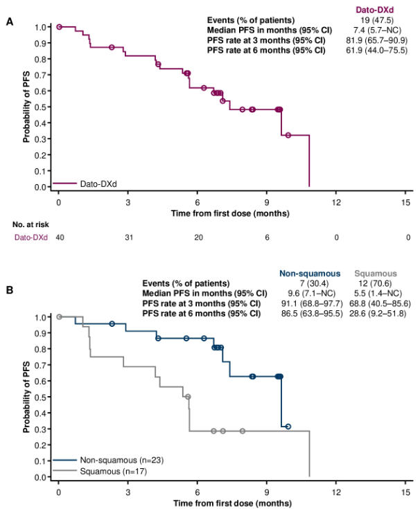 结果显示,截至2023年10月9日,中位随访时间8.1个月,经确认ORR达45.0%,中位缓解持续时间(DoR)为8.3个月,疾病控制率(DCR)为85%,中位无进展生存期(PFS)为7.4个月。非鳞癌亚组展现了更令人鼓舞的抗肿瘤活性和生存获益,其ORR高达56.5%,中位PFS长达9.6个月(图1、2)。安全性方面,该队列未观察到新的安全信号,且未出现药物相关间质性肺病(ILD),临床总体可控可耐受。
